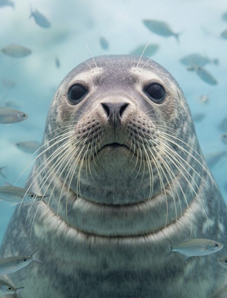Bearded seals are medium to large seals, typically weighing between 550 and 880 pounds. They derive their name from the thick, bristle-like vibrissae (whiskers) around their muzzle, which are highly sensitive and help them detect prey on the ocean floor. These seals have a robust body with a pale grey or brown coat and dark spots, blending effectively with their icy environment.