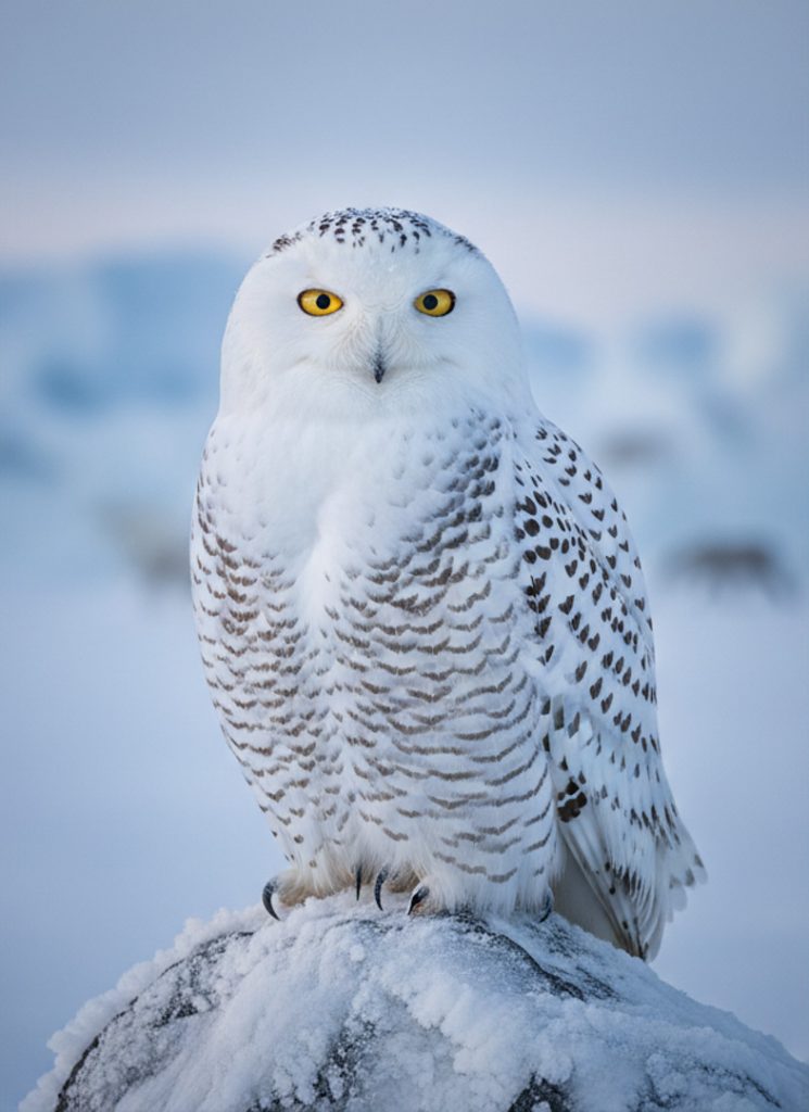 Snowy Owls inhabit open Arctic tundra regions, where extreme cold and limited vegetation dominate. Their thick feathers provide insulation against freezing temperatures, while their keen eyesight and silent flight make them formidable hunters. Unlike many owls, Snowy Owls are largely diurnal, hunting both day and night to maximize food intake during the short Arctic summer.